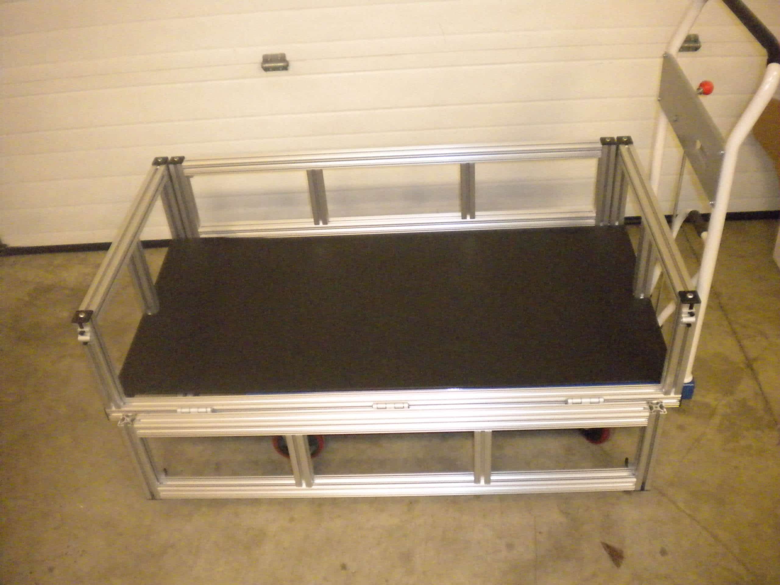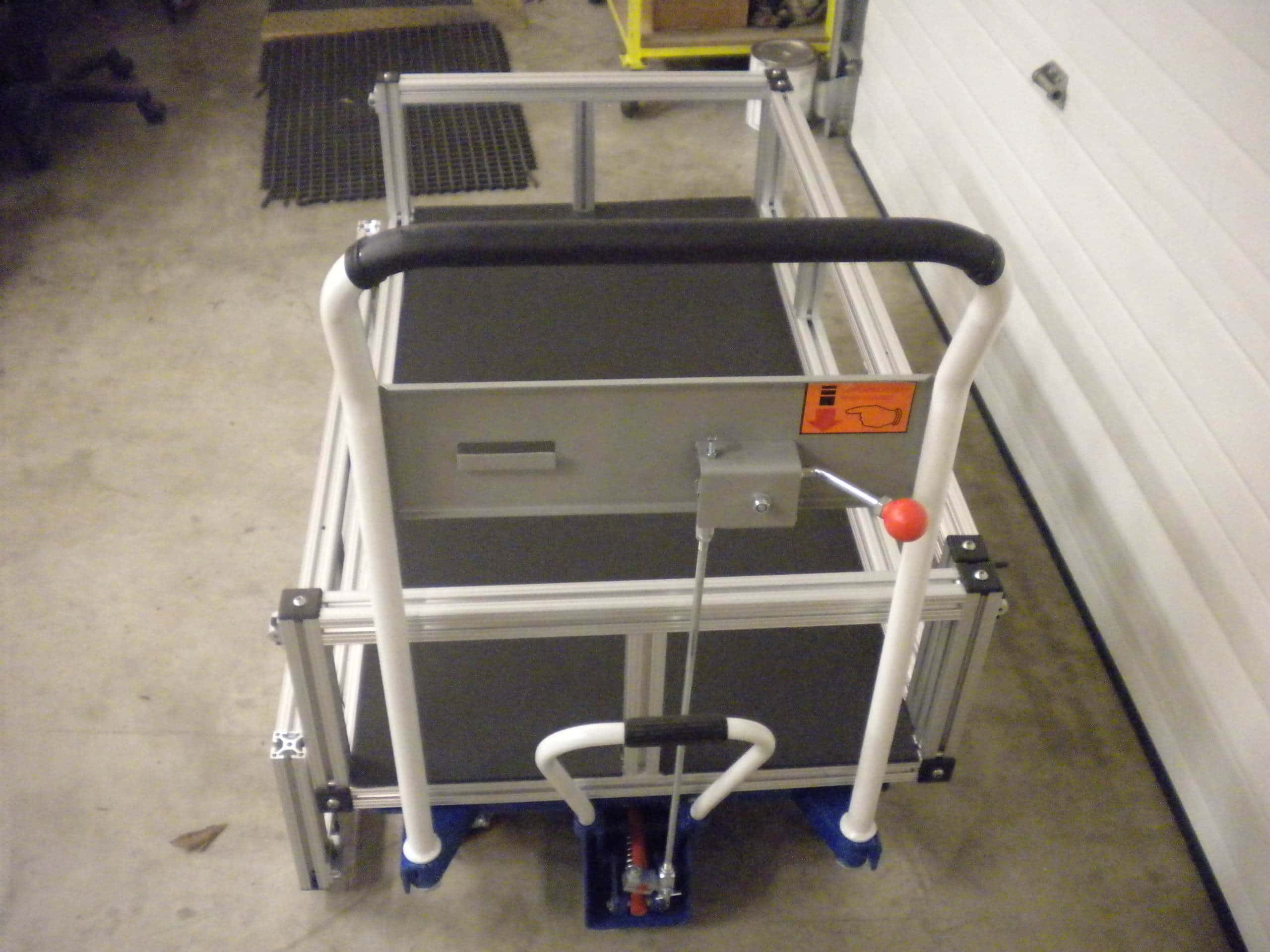 The second way is for sedated or special needs passengers. We modified a lift cart with 80/20 extrusion and hardware. It can raise high enough to receive a patient from an examining table. It has side gates to secure the patient and then the cart may be lowered for transport through the halls to the van.