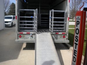There are two ways animals may enter the van. The first way is under their own power by the use of the extendable ramp that came installed with the van. Notice how the aluminum welded gating that we fabricated helps direct the path of the oncoming passenger.