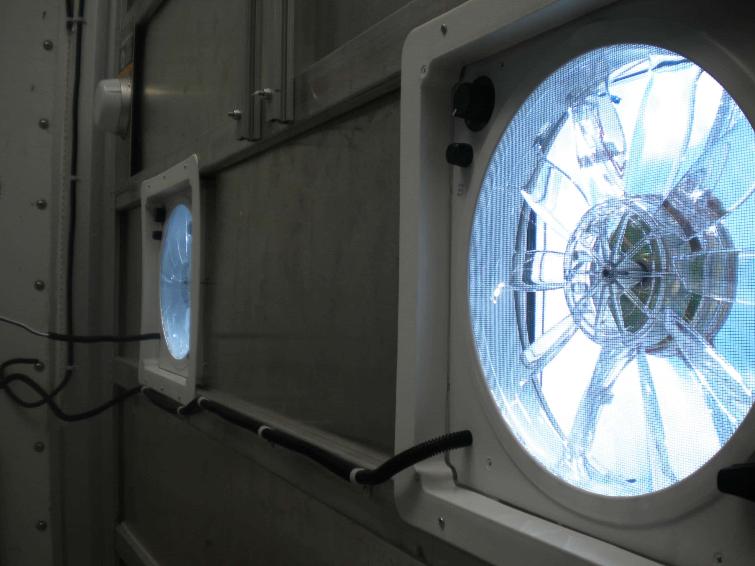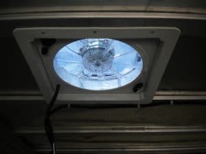 As you can imagine once the van has a passenger and is buttoned up for travel, it’s going to get hot and funky in the compartment. There are no windows to roll down, nor can you drive with the back door open. Our solution was to install 2 RV ventilation fans. The fans provide enough circulation to cool the compartment and provide some light.