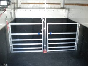 We took into consideration the size of the van and the types of animals that would be transported and determined that this van would be best suited to carry no more than 2 passengers at any given time. Our welding shop went straight to work constructing 2 pens from aluminum with a divide and gates to ensure safety. The sidewalls are covered in ABS and the floor of the van is covered with soft and heavy-duty rubber mats. These features ensure the riders have enough room to stretch out, sit, or sleep-and not slip around.