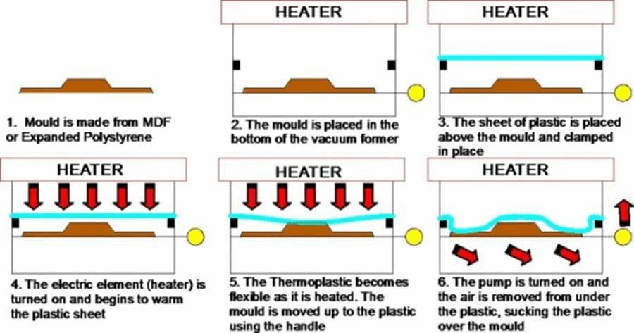 The vacuum forming process is very simple. It uses a flat sheet of rigid plastic which once heated to a softened state is then drawn into or over a mold, often referred to as a tool. Once cooled back to the rigid state, it is removed from the mold and trimmed. This process is slower than injection molding however it offers quick-to-make molds or tooling so that you can go from an idea to a finished product in much less time than it takes to create molded parts with other processes such as injection molding and roto-molding.